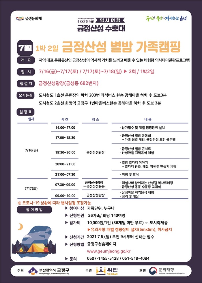 이번 행사는 오는 16일부터 18일까지 1박 2일 캠핑으로 총 2회 진행된다. △금정산성잔디광장 가족캠핑, △별밤 가족운동회, △별밤 콘서트, △별밤 별자리이야기, △금정산성 이슬길 역사트레킹 등 여름밤의 향취를 만끽할 수 있는 다양한 공연과 흥미로운 체험 이벤트로 구성된다.참가자들은 가족당 1개의 개별 캠핑 장비를 지참하여 참가해야 하며 체온 측정, 마스크 착용 등 코로나19 방역 수칙을 준수해야 한다.