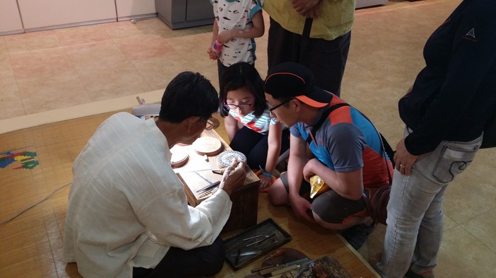 ▲고창 고인돌박물관을 방문한 관람객들이 윤도 제작 과정을 바라보고 있다.