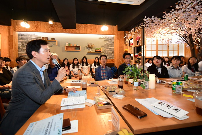| ▲노작마을 살리기 프로젝트 발표회에서 학생들과 대화를 나누고 있는 서철모 화성시장.(화성시 제공) |