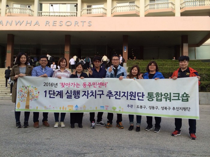 ▲찾아가는 동 주민센터 1단계 실행 자치구 추진지원단 통합워크숍에서 관계자들이 기념촬영을 하고 있다. |