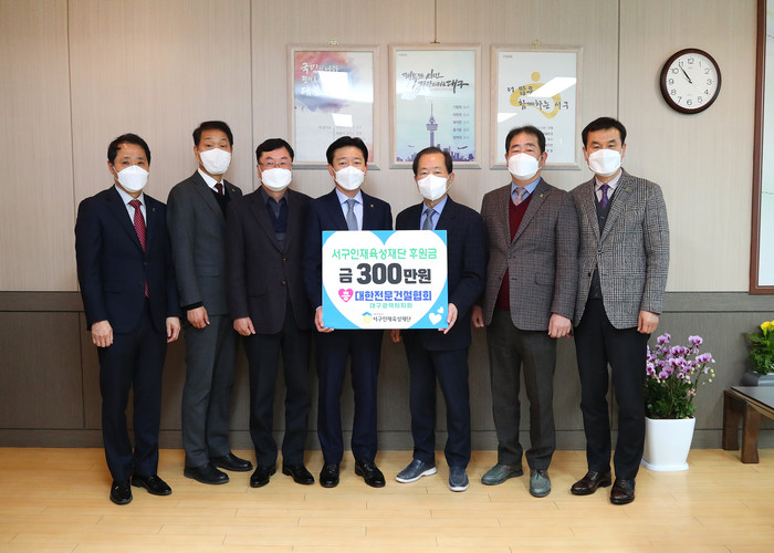 대한전문건설협회 대구광역시회는 전문건설업자의 상호협력 강화로 견실시공을 위한 제도개선을 추진하는 협회로 2017년부터 지금까지 매년 300만원씩 6년째 (재)서구인재육성재단에 후원해오고 있다.