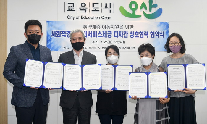 [로컬세계 김병민 기자]경기 오산시는 지난 26일 오산시사회적경제협의회, 오산신용협동조합, 평택오산아이쿱소비자생활협동조합, 한살림 경기서남부소비자생활협동조합 등 4개 기관과 취약계층아동지원을 위한 사회적경제사회서비스지원 다자간 업무협약을 체결했다고 27일 밝혔다.