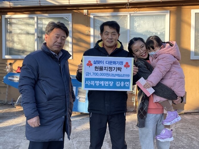 [로컬세계=박상진 기자]경북 의성군(군수 김주수) 사곡면 명예면장 김웅연(케이에스테크(주) 대표)은 지난 16일 설 명절을 맞이하여 사곡면 다문화가정 17명을 대상으로 가정의 건강과 행복을 기원하며 총 170만원 상당 선물을 전달했다.