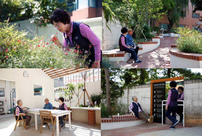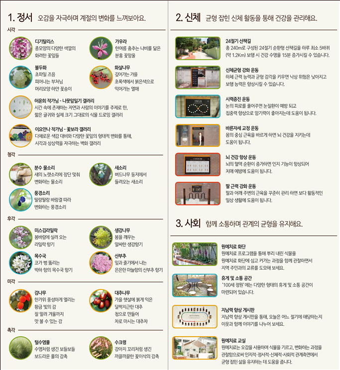 예컨대, 24절기를 따라 걸을 수 있는 240m 길이 산책로엔 절기별 대표 꽃·나무 100여 종을 심어 오감을 자극한다. 산책로 곳곳엔 운동기구를 설치해 신체활동으로 인한 자극을 유도한다. 어르신들이 직접 식물을 기를 수 있는 화단, 식물 가꾸기를 교육하는 원예치료 교실, 미술작품이 전시된 감성충전 갤러리 공간은 정서적 자극을 유도한다. 소통·휴게 공간에선 다른 어르신들과 소통하면서 사회적 교류를 촉진한다.