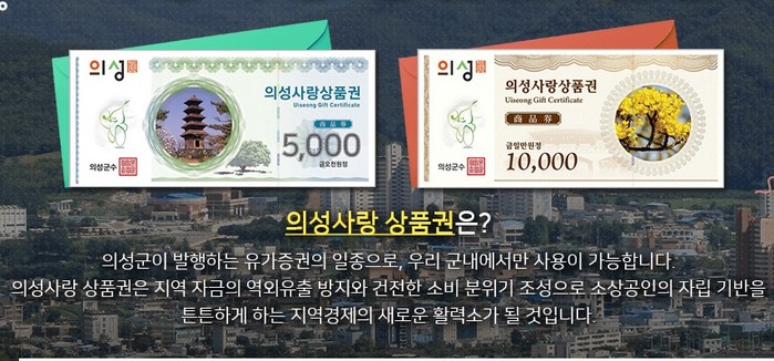 의성사랑 상품권은 지역상권 활성화를 위해 의성군에서 발행한 지역화폐로, 6%할인된 가격으로 구매해 생활과 밀접한 관련이 있는 각종 소매점, 마트, 전통시장, 음식점, 주유소, 서비스업 등 1340여 개의 가맹점에서 현금처럼 사용할 수 있다.