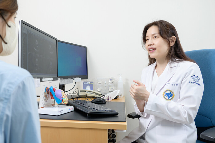 ▲강동경희대학교병원 심장혈관내과 진은선 교수(사진 오른쪽)가 한 환자와 진료 상담하고 있다. |