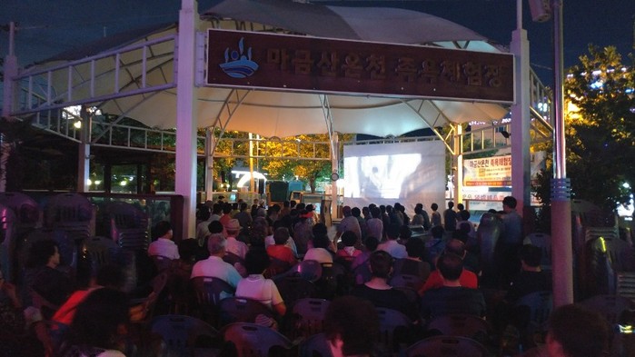 | ▲마금산온천 족욕체험장 ‘별밤 가족 영화 축제’에서 영화를 상영하고 있다.창원시 제공) |