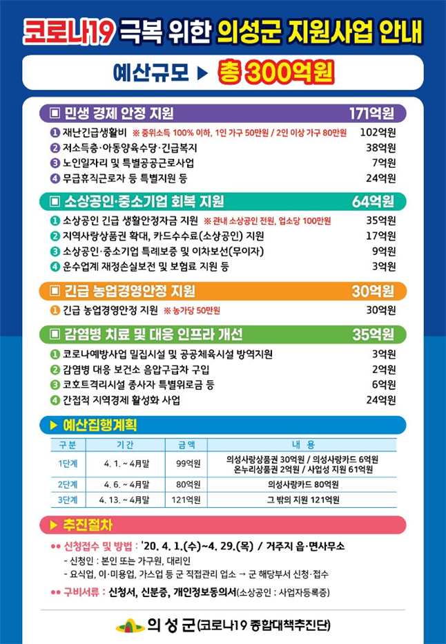 2단계는 4월 6일부터 의성사랑카드를 통해 현금성 80억원을 지원하고, 3단계는 13일부터 말일까지 집행한다.