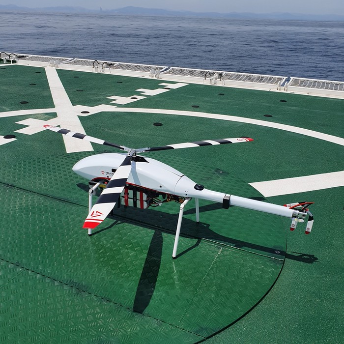 17일 남해지방해양경찰청은 해경의 첫 무인헬기(VELOS V2)를 배타적 경제수역에 대한 경비를 전담하는 부산해양경찰서 소속 1500톤급 대형함정(1501함)에 배치했다.