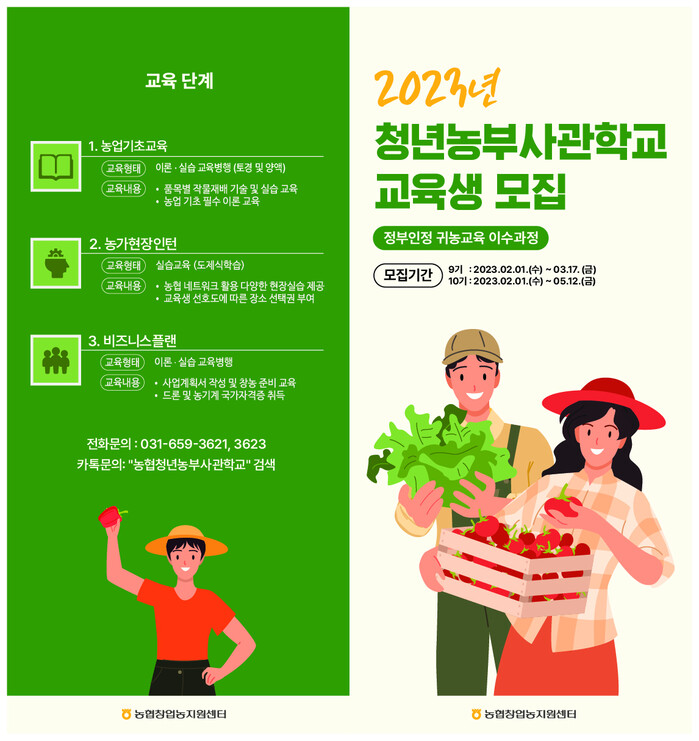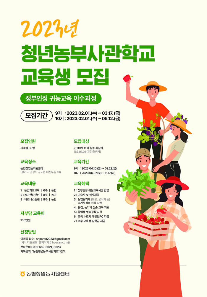 농협중앙회는 미래 농업의 혁신동력인 예비 청년농업인 육성을 위해 2023년도 농협청년농부사관학교 제 9기·10기 교육생 모집을 2월 1일부터 시작한다고 밝혔다.