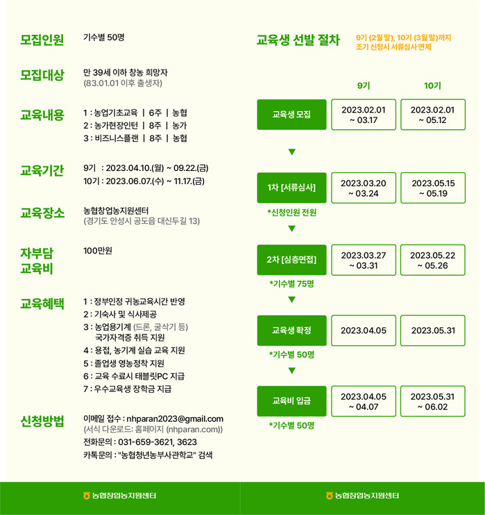 각 기수별 50명씩 2개 기수로 총 100명을 모집할 예정이며 모집대상은 만 39세 이하의 농업분야에 열정을 가진 사람 누구나 지원 가능하고 모집일정은 9기 교육생은 2월1일 ~ 3월17일, 10기 교육생은 2월1일 ~ 5월12일까지 지원서를 접수하면 된다.
