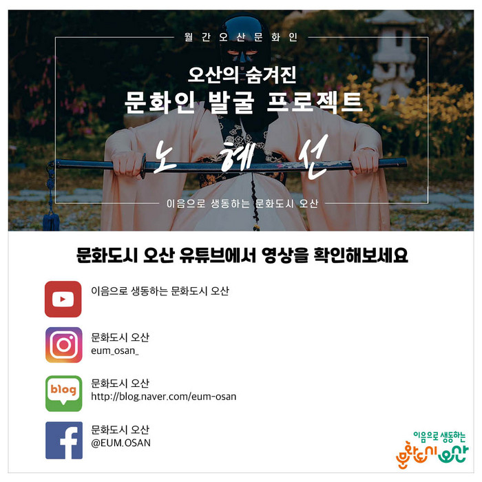 오산이음문화도시센터는 '월간 오산 문화인'을 통해 지역의 숨겨진 문화인을 발굴하고 조명함으로써 코로나19로 제한된 시민의 문화향유 기회를 확대해 지역 특색을 갖춘 문화도시 지정을 위해 노력할 계획이다.