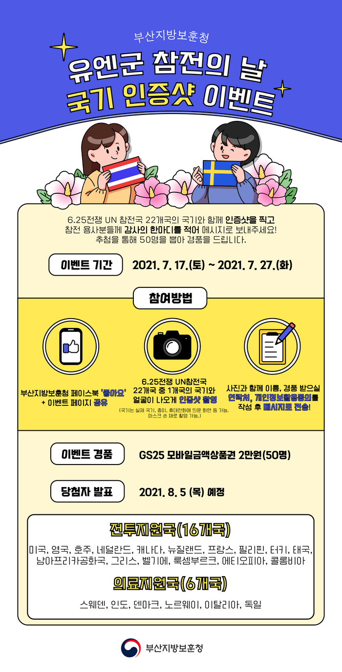 이벤트는 부산지방보훈청 페이스북에서 7월 17일(토)부터 7월 27일(화)까지 진행된다. 응모 방법은 6·25전쟁 UN참전국 22개국의 국기와 함께 인증샷을 찍고 참전 용사분들께 감사의 한마디를 적어 페이스북 메시지로 보내면 된다. 자세한 내용은 부산지방보훈청 페이스북에서 확인 가능하다.