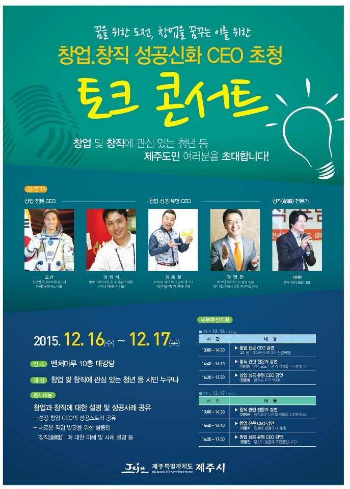 제주시는 오는 16일부터 17일 까지 2일간 ‘창업(직) 성공신화 CEO 등 초청 토크콘서트’를 진행한다고 밝혔다.
