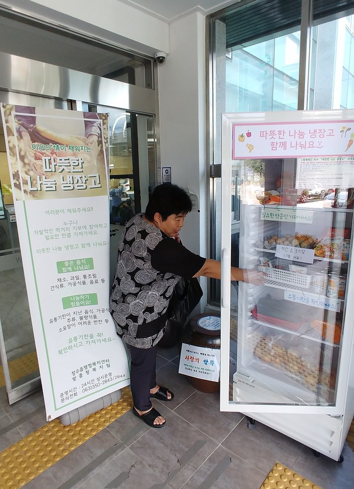 먹거리 나눔 기부는 장수읍지역사회보장협의체와 장수군자활센터 푸드뱅크를 중심으로 기부가 됐으나 현재는 많은 주민들의 관심과 참여로 사과, 토마토, 시금치, 고추 등 과채류부터 라면, 통조림 같은 가공식품까지 냉장고를 가득 채우고 있다.