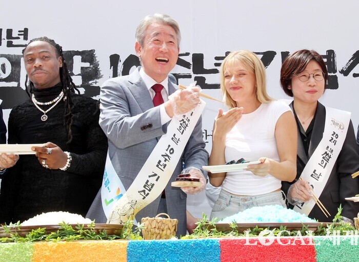 이어서 쌀의 날 10주년을 기념하여 강호동 회장을 비롯한 주요 내빈 10여 명이 전국 각지의 기능성 쌀을 활용해 전국 8도를 표현한 ‘8색 김밥’을 만들고 외국인, 대학생 등 행사 참석자들과 함께 시식하는 퍼포먼스를 펼치며 최근 K-푸드(K-Food) 열풍을 이끌고 있는 김밥의 매력을 선보였다.