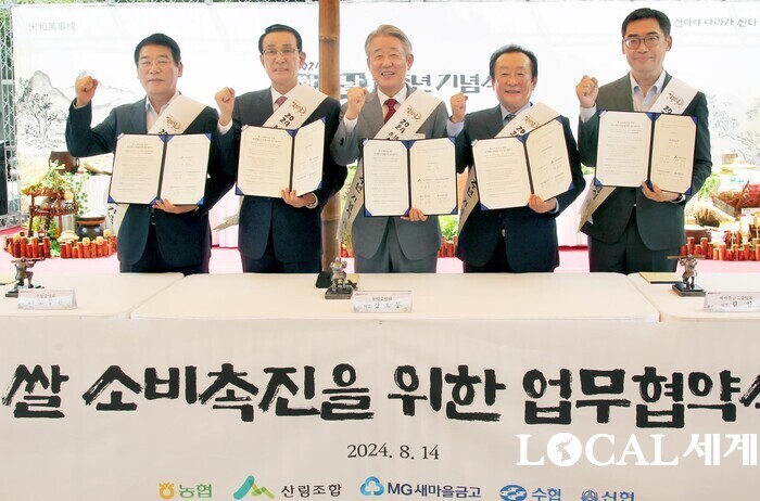 ▲강호동 농협중앙회장이 14일 오전 서울 중구 한국의집에서 열린 2024 쌀의 날(8.18) 10주년 기념식에서 협동조합 회장단과 함께 쌀 소비 촉진 업무협약을 체결한 후 기념촬영을 하고 있다.(왼쪽부터)최창호 산림조합중앙회장, 노동진 수협중앙회장, 강 회장, 김인 새마을금고 중앙회장, 손성은 신협 사업대표이사 |