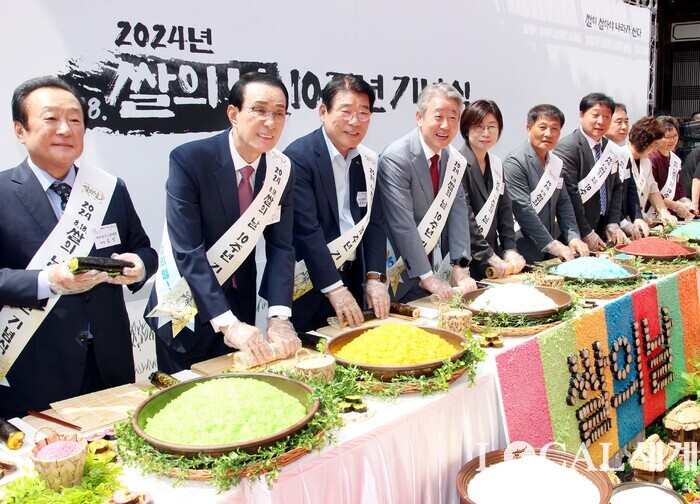 ▲강호동 농협중앙회장(가운데)이 14일 오전 서울 중구 한국의집에서 열린 2024 쌀의 날(8.18) 10주년 기념식에서 참석자들과 8색김밥 만들기 퍼포먼스를 하고 있다. |