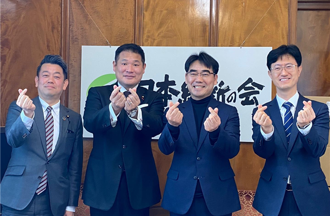 ▲부산시 이성권(오른쪽에서 두 번째) 경제부시장이 일본 의회의 유신회 소속 의원(좌측부터 오사카 지역구, 오쿠시타 타케미츠. 후쿠오카 지역구, 야마모토 고세이)들과 만나 2030부산세계박람회 유치 지지를 요청한 뒤 기념촬영을 하며 양국간의 우의를 다짐하는 동작을 취하고 있다. · 부산시 제공 |