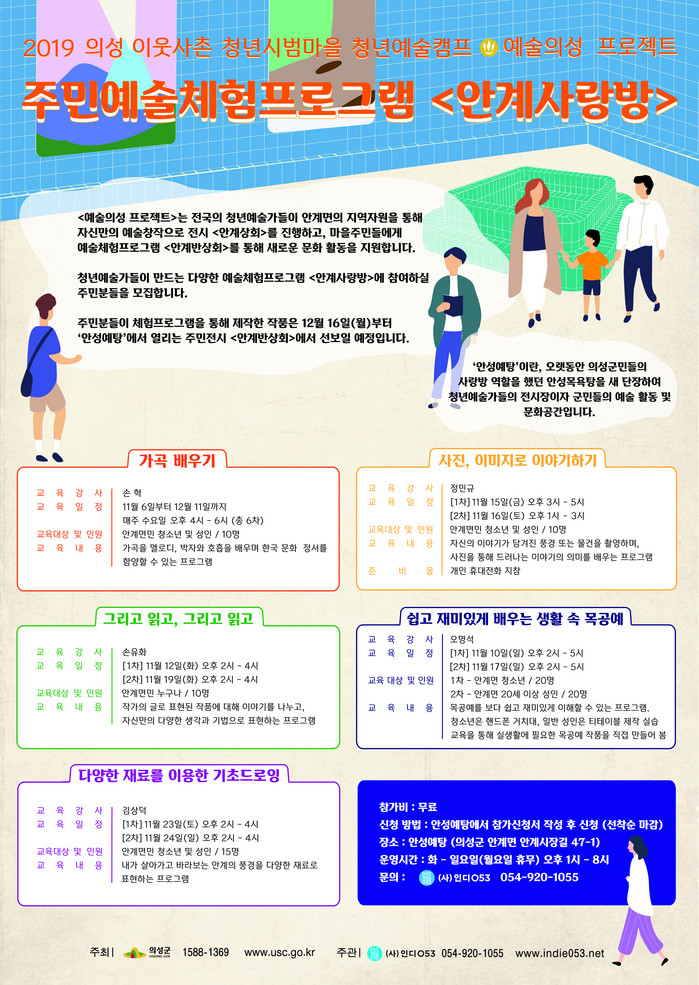 또한 안성예탕에서는 주민들을 위한 예술체험프로그램인 ‘안계사랑방’도 운영하고 있으며, 예술가들이 직접 가곡, 목공, 기초드로잉 등 예술에 흥미를 느낄 수 있는 프로그램을 준비해 11월의 사랑방을 채웠다. 참가신청은  안성예탕에 직접 방문해 할 수 있고, 참가비는 무료이다.