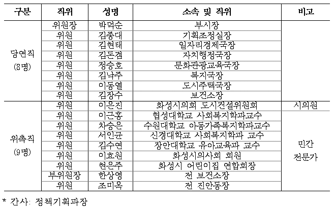 화성시 인구정책위원회는 결혼, 임신, 출산, 양육 등 관련 분야에 경험과 학식이 풍부한 전문가와 관계 공무원 및 화성시의원 등 17명으로 구성됐으며, 인구정책 기본계획, 지원사업 등을 심의·자문한다. 임기는 2년이다.