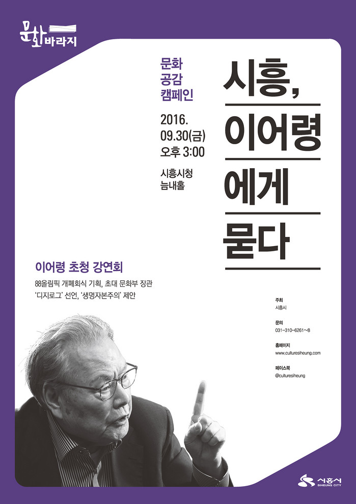 이번 강연은 문화공감 캠페인 ‘시흥에서 문화를 말하다’ 제4화로 ‘시흥, 이어령에게 묻다’라는 주제로 열린다.
