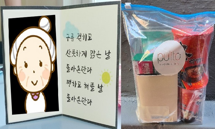 코로나19 극복키트는 마스크, 손소독제, 컵라면 등의 생필품과 코로나19를 이겨내자는 응원의 메시지를 담겨있다.