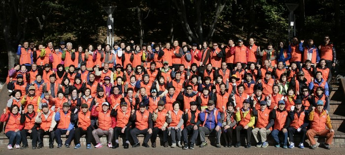 ▲지난 31일 마포구인재육성장학재단이 기부문화 확산을 위해 열린 걷기대회에서 참석자들이 화이팅 포즈를 취하며 기념촬영을 하고 있다. |