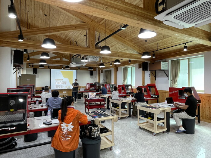 CNC체험지도사 자격증반은 ㈜에스디상사(SD메이커스 교육개발원)와 업무협약을 통해 안성 서운산 목재문화체험장에서 시행하는 것으로 지난 2월에 이어 2회차 교육을 실시한다.