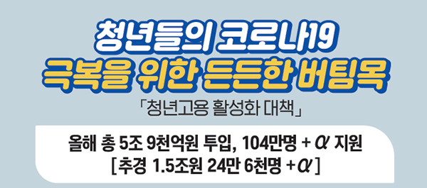 정부가 지난해 수립한 ‘청년정책 기본계획’ 등에 포함된 기존 정책에 1조 5000억원, 24만 6000명(+α)을 추가로 지원해 올해 총 5조 9000억원으로 104만명(+α)의 청년들에게 필요한 지원을 추진한다.