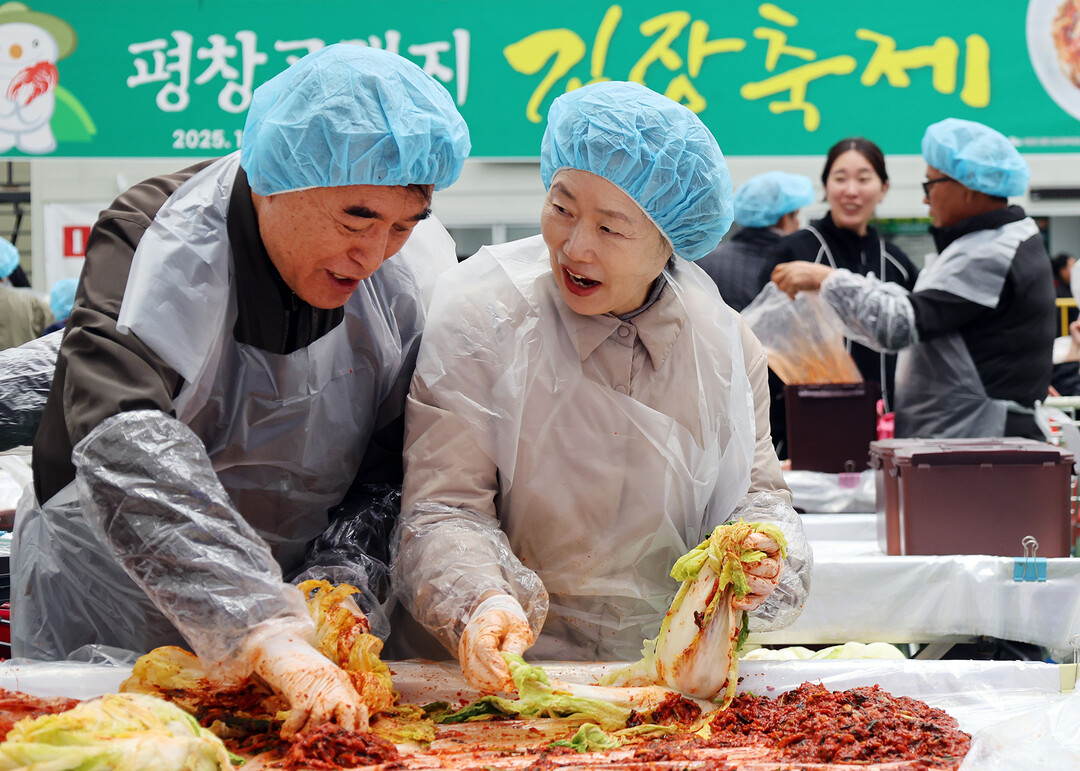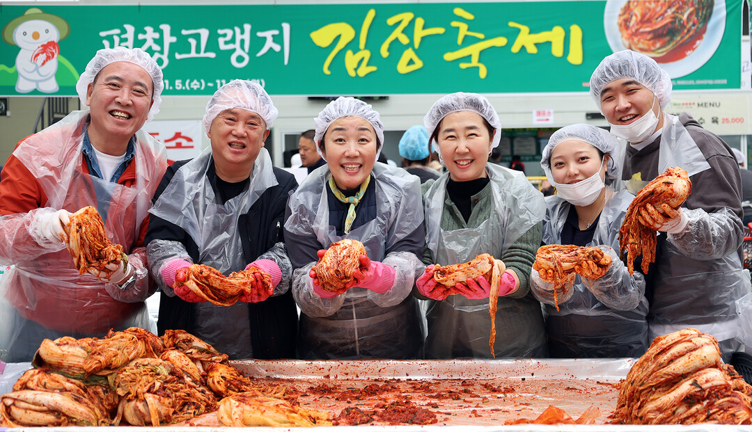 9일 휴일을 맞아 강원 평창군 진부면민체육공원에서 개막한 제8회 평창고랭지김장축제를 찾은 방문객들이 김장을 담그고 있다.