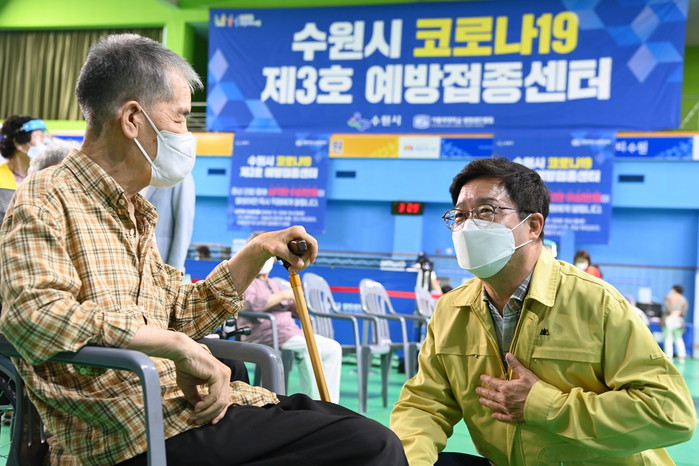 | ▲지난 6월 수원시 제3호 예방접종센터 현장을 방문한 염태영 시장이 접종을 기다리는 어르신과 대화를 나누고 있다. 수원시 제공 |