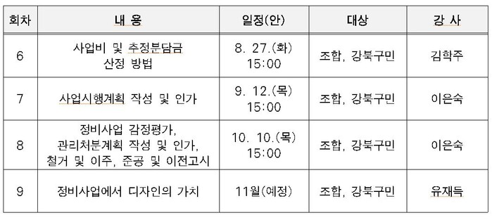 아울러 9~11월 동안에는 사업시행계획 및 관리처분계획의 작성, 정비사업에서 디자인의 가치 등을 주제로 정비사업 아카데미를 열 예정이며 자세한 개최 시기와 내용은 당월 소식지 및 강북구 홈페이지를 통해 홍보할 계획이다.