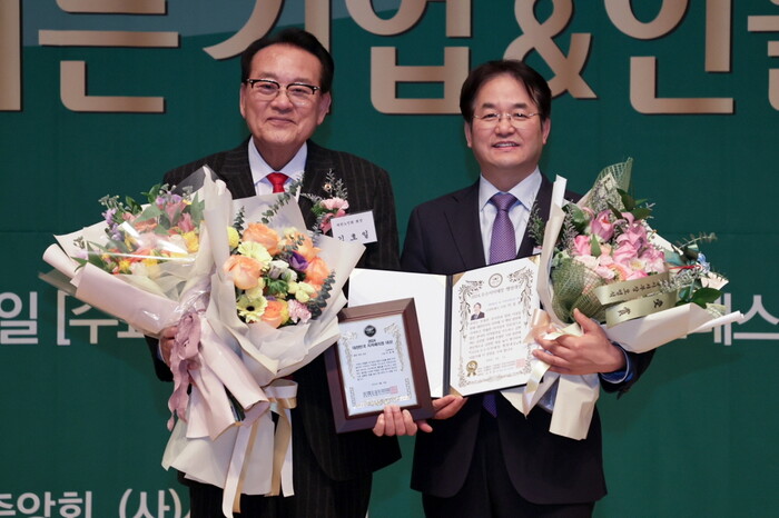▲ 이동환 고양특례시장(우)이 수상 후 김호일 대한노인회장(좌)과 기념 촬영을 위해 포즈를 취하고 있다. |