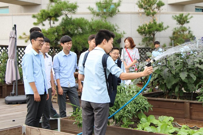 ▲대전시청사에 조성된 옥상텃밭에서 학생들이 채소에 물을 주고 있다. |