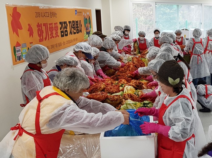 ▲13일 고한 중앙교회에서 ‘2018년 KLACC과 함께하는 화기애애 김장 자원봉사’에 참가한 자원봉사자들이 김장 김치를 담그며 환하게 웃고 있다.(강원랜드중독관리센터 제공) |