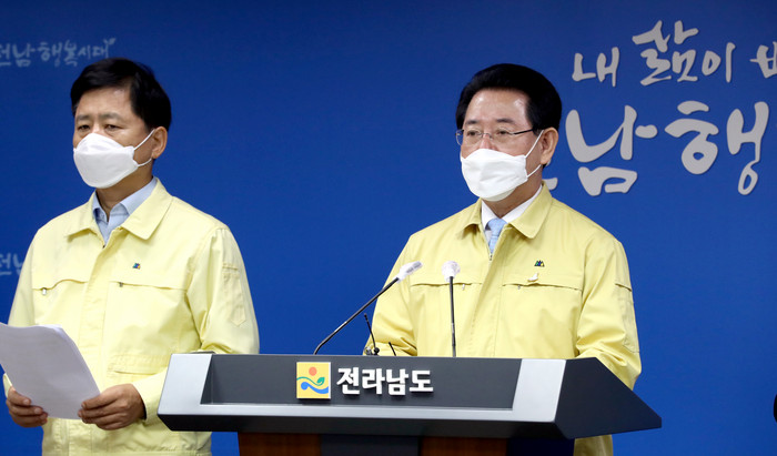 ▲김영록 지사가 1일 도청 브리핑룸에서 긴급 발표를 하고 있다.(전남도 제공) |
