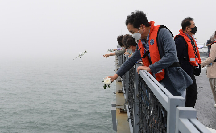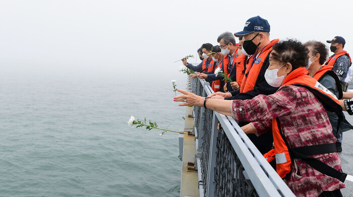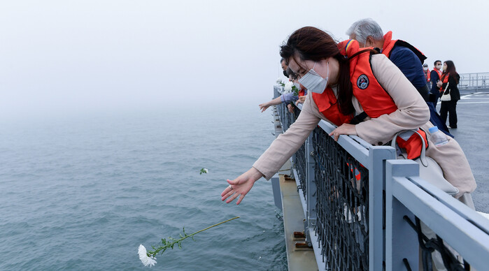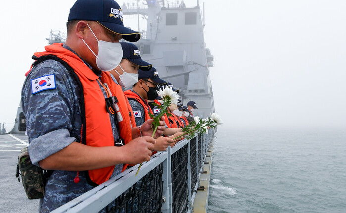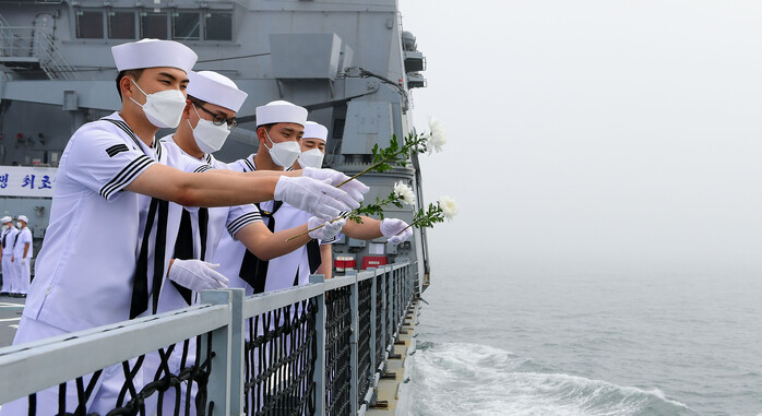 [로컬세계 맹화찬 기자]25일 오전 해군 승조원들과 백두산함 유가족들이 대한해협해전이 벌어졌던 부산 앞바다에서 해상헌화하며, 당시 전사한 故 전병익 중사와 故 김창학 하사를 추모했다.