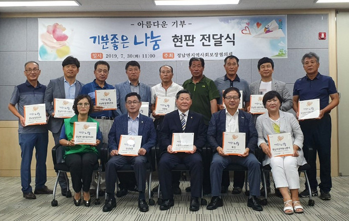 [로컬세계 고용주 기자]경기 화성시는 30일 정남면 행복복지센터에서 지역 내 정기후원 업체 및 사회단체에 감사의 마음을 전달하고 이를 계기로 기부문화를 확산시키고자 ‘기분좋은 나눔’ 현판 전달식을 개최했다고 밝혔다.
