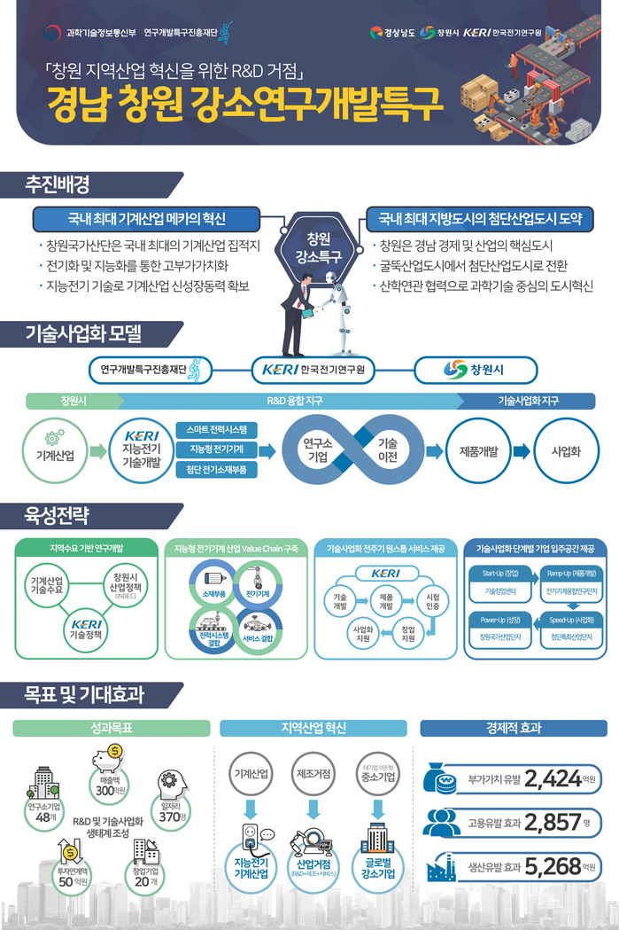 따라서 한국전기연구원과 함께 “성주동에 위치한 KERI 0.2㎢와 창원국가산업단지확장구역 0.43㎢의 배후공간을 ‘지능전기 기반 기계융합 특구’로 조성하고, 전담조직 배치와 지역 내 산학연과 협력체계를 구축해 전략적으로 강소특구를 육성할 계획”이라고 강조했다.