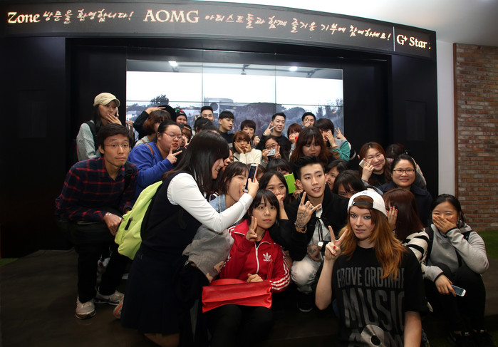 ▲강남구 ‘나눔과 기부의 행복공간, G+스타존’ 시즌 4 홍보대사인 가수 박재범 씨가 팬들과 포즈를 취하고 있다. |