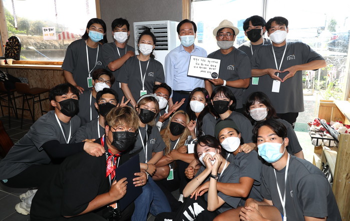 ▲김주수 군수가 지난 22일 안계면 위천생태공원에서 열린 ‘청년창업 플리마켓’에 참가한 청년들과 기념촬영을 하고 있다. |