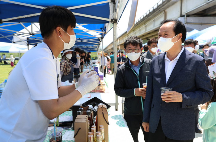 ▲김주수 군수(오른쪽)가 지난 22일 안계면 위천생태공원에서 열린 ‘청년창업 플리마켓’ 현장을 찾아 청년들을 격려하고 있다. 의성군 제공 |
