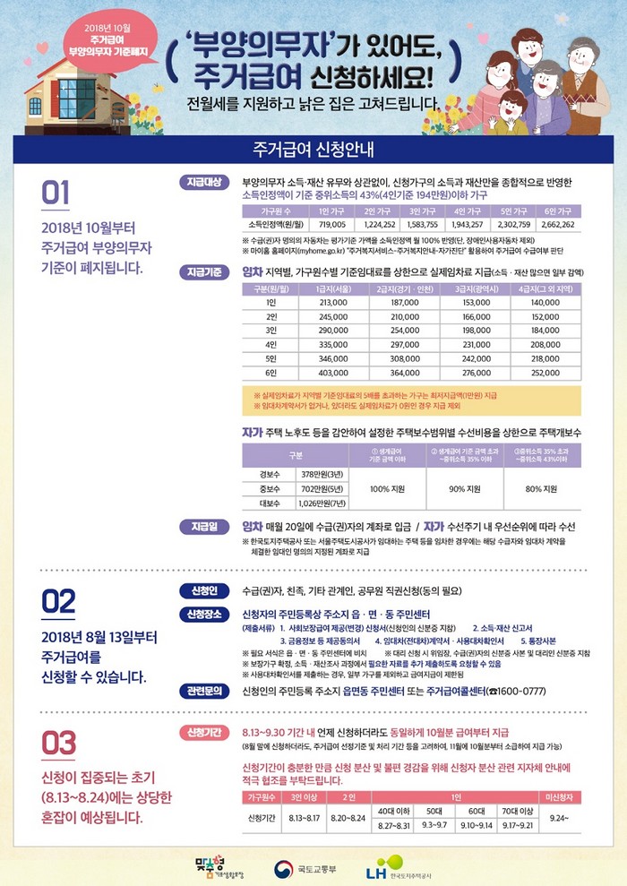 주거급여 부양의무자 기준 폐지로 인해 부양능력이 있어도 사실상 부양 의사가 없는 부양의무자로 인해 급여를 수급할 수 없는 가구 등 주거안정 사각지대에 놓인 저소득 가구들도 지원을 받을 수 있게 됐다.