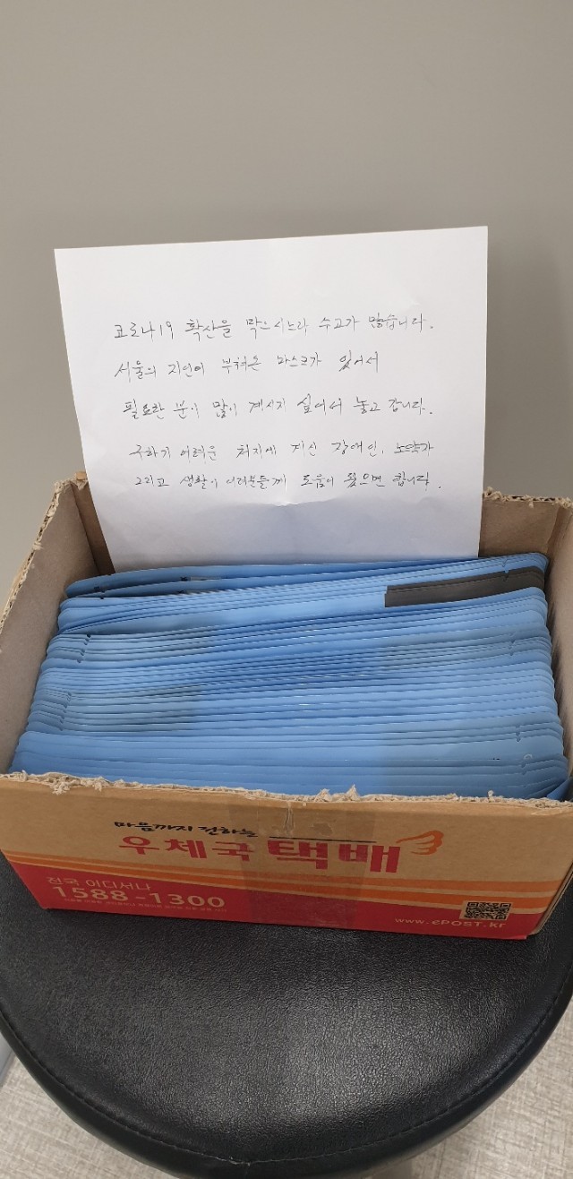 이 주민이 전달한 손편지에는 “코로나19 확산을 막으시느라 수고가 많습니다. 서울의 지인이 부쳐온 마스크가 있어서 필요한 분이 많이 계시지 싶어서 놓고 갑니다. 구하기 어려운 처지에 계신 장애인, 노약자, 그리고 생활이 어려운 분들께 도움이 됐으면 합니다”라고 적혀있었다.