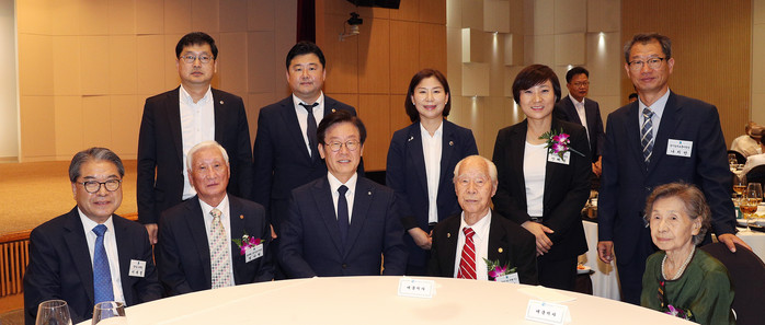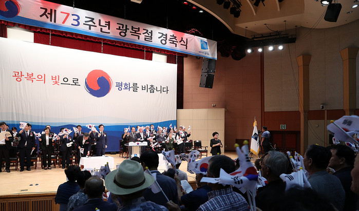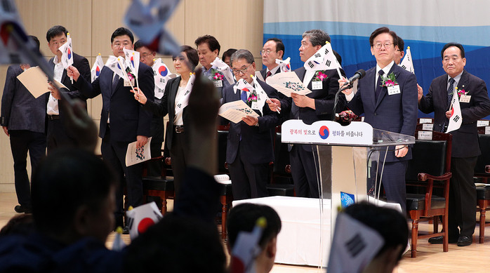 | ▲15일 오전 경기도 경제과학진흥원에서 열린 제73주년 광복절 경축식에서 이재명 경기도지사가 송한준 경기도의회 의장, 이재정 경기도 교육감, 애국지사를 비롯한 참석한 내빈들과 광복군 행진곡을 합창하고 있다. |