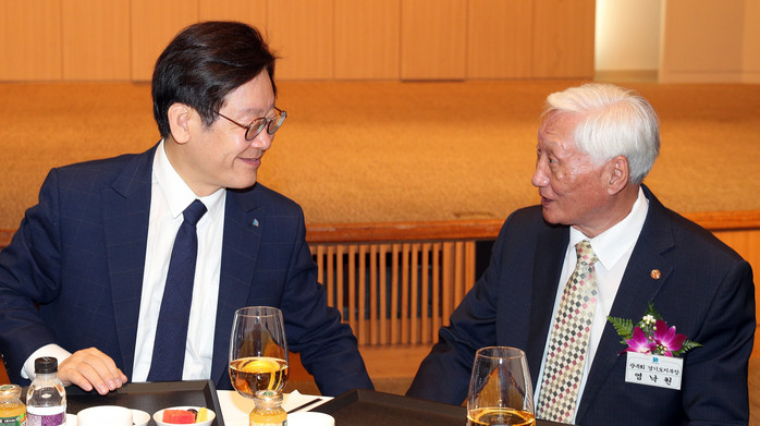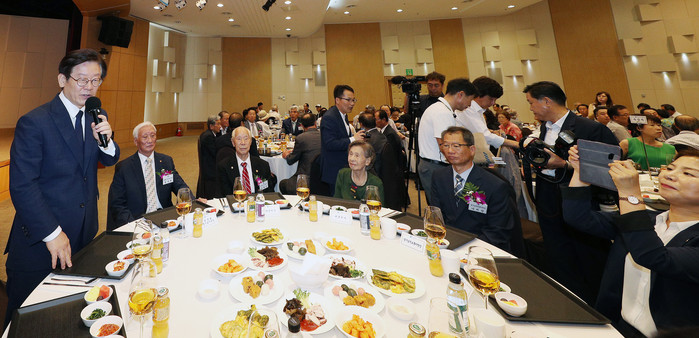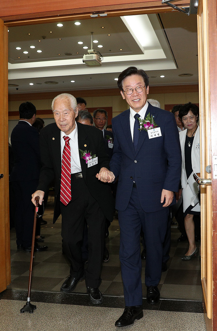 | ▲15일 오전 경기도 경제과학진흥원에서 열린 제73주년 광복절 경축식에서 이재명 경기도지사가 이영수 애국지사를 부축하며 식장을 입장하고 있다. |