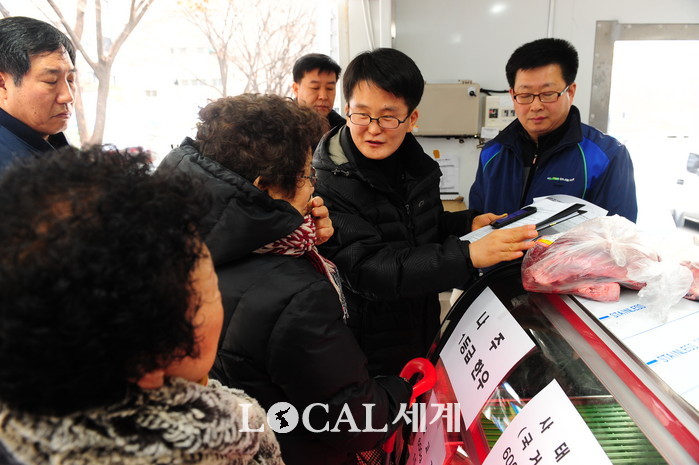 ▲ 서울 동대문구 보건위생과 공무원이 한 정육점에서 고기 위생 상태를 점검하고 있다. |
