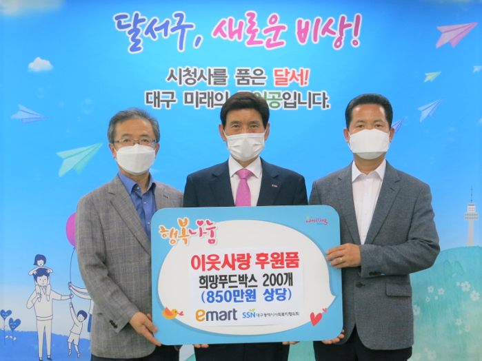 [로컬세계 박세환 기자]대구 달서구는 지난 9일 ㈜이마트 월배점과 달서구사회복지협의회가 참석한 가운데 관내 취약계층에게 후원할 희망푸드박스(850만원 상당) 전달식을 가졌다고 11일 밝혔다.