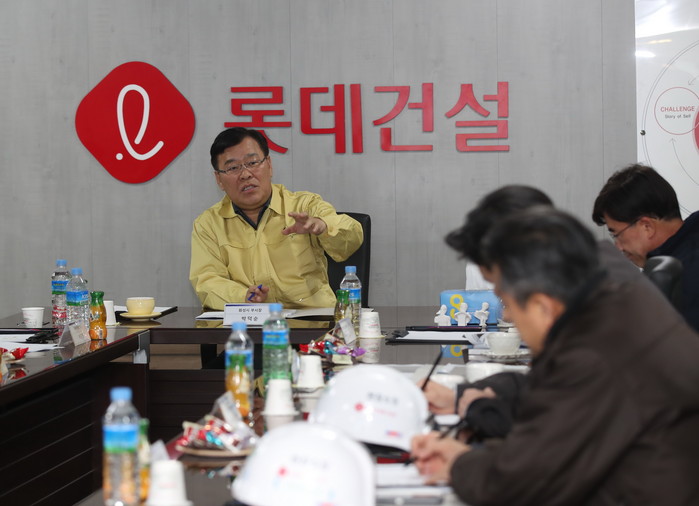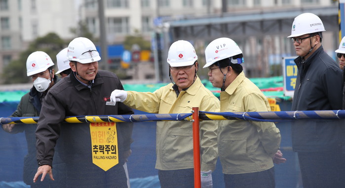 | ▲박덕순 화성시부시장(가운데)이 동탄역 롯데캐슬 주택건설현장을 방문해 점검활동을 하고 있다.(화성시 제공) |